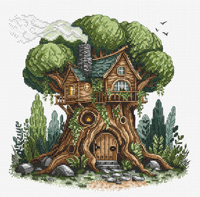 The "Tree House" Kit is a true gem for cross-stitch lovers who enjoy recreating fantasy and nature scenes. The design shows a cozy house nestled in the branches of a sturdy tree, surrounded by green foliage and a gently cloudy sky that evokes a calm and magical atmosphere.