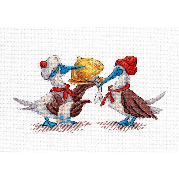 The "Fish Lunch" cross stitch kit from MP Studia (SNV-898) depicts a fun and charming scene featuring two seagulls sharing a fish. A design full of humor and movement, perfect for those who enjoy decorative stitching with cheerful and original scenes .