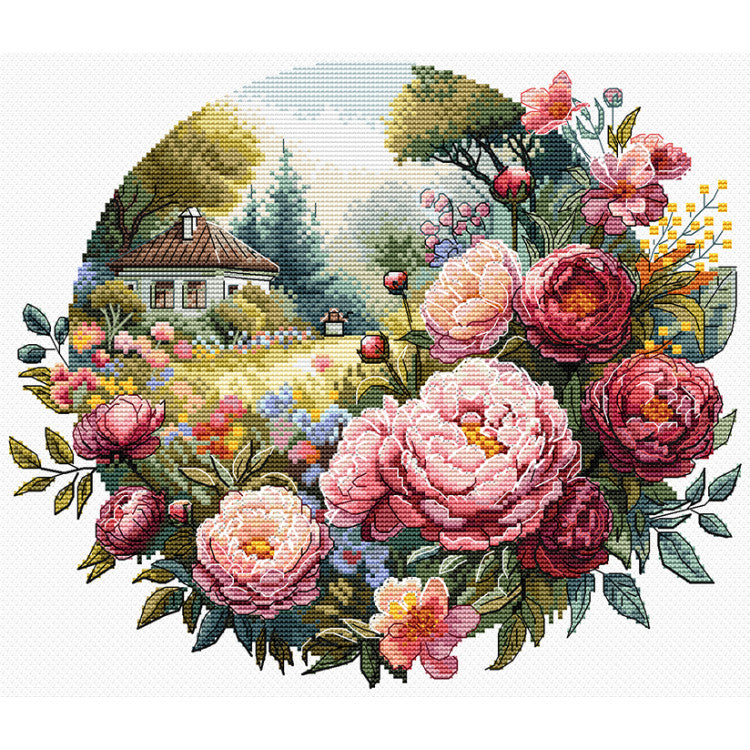 El kit de punto de cruz “El aliento de la mañana” de Andriana (SAND-46) es una delicada escena llena de luz y armonía: un jardín en calma al amanecer, con una casa de campo al fondo y exuberantes flores rosadas en primer plano. Una composición circular elegante que transmite frescura, serenidad y la belleza de los primeros momentos del día.