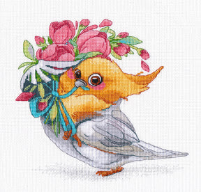 A cross stitch kit titled "The Feathered Knight" S1592. This kit is designed to create an image of an adorable bird adorned with a wreath of brightly colored flowers. The kit includes:
