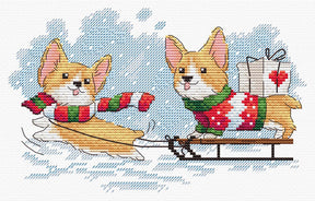 The MP Studia SM-775 – We'll Be on Time cross stitch kit captures the joy of winter with two cute corgi puppies playing in the snow and carrying holiday gifts. Its sweet and colorful design, full of movement and energy, is ideal for animal and holiday lovers.