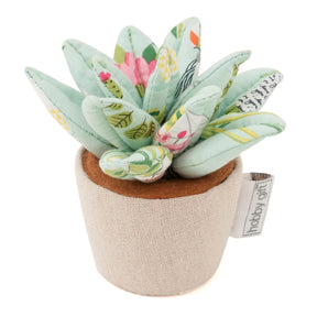 The highlight of this pin cushion is its unique design. It is in the shape of a plant in a beige pot. Its leaves are decorated with a pastel green fabric with prints of various plants and flowers.