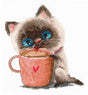 A lovely cross stitch kit titled "Coffee Lovers. Cat" SANK-64. This kit is designed so you can get started right away with your embroidery project, creating an image of a cat with big blue eyes taking a sip from a cup of coffee, making it a perfect project for cat and animal lovers. coffee.