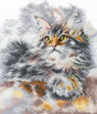 A detailed and lovely cross stitch kit titled "GREY CAT" SAND-33. The kit is designed to provide the user with all the materials and instructions necessary to complete a beautiful representation of a fluffy gray cat with striking eyes and a serene expression.