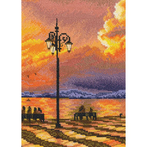 The Romantic Sunset counted cross stitch kit allows you to capture the beauty of a sunset in a city, where a street lamp softly illuminates the path and the shadows of people blend with the warm tones of the sky. This design is perfect for those looking to embroider a nostalgic and romantic scene with urban details.