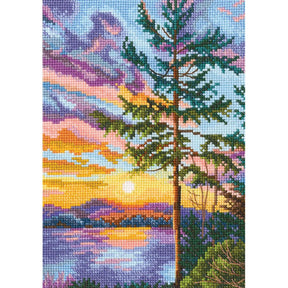 The Sunset Landscape counted cross stitch kit captures the serenity of a beautiful sunset by a lake, with vibrant shades of oranges, purples and blues illuminating the sky and water. This design is ideal for those looking to stitch a natural landscape full of color and peace.