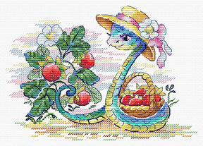The "Berry Harvest" cross stitch kit SM-792 by MP Studia features a charming snake with a hat gathering fresh berries in a beautiful garden setting. This original and colorful design is ideal for those looking for a fun and lively project. The kit includes: