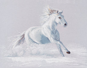 A majestic white horse gallops through the snow, a symbol of strength, freedom, and pure elegance. This design conveys serenity and movement, making it ideal for those who love nature and noble animals.