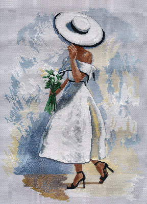This embroidery kit captures a poetic moment, where the central figure stands out for her white dress and hat, offering a sophisticated and timeless image to adorn any space. Each component of the kit has been carefully selected to provide an enjoyable and satisfying embroidery experience.