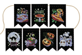 Decorate your home with a touch of mystery and magic with the cross-stitch kit "Witchcraft Stories Garland" ST-1078 by MP Studia. This charming garland, made up of seven flags with Halloween-themed designs, is perfect for adding a festive and spooky atmosphere to your home.