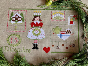December 13 is a Sampler cross stitch scheme in color with Christmas motifs