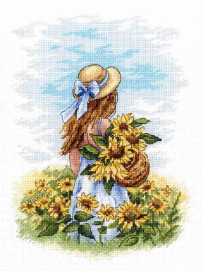 The MP Studia “Through the Sunny Field” cross stitch kit SNV-849 features a charming scene of a young girl walking through a field full of sunflowers, wearing a straw hat and blue dress that capture the essence of summer. This beautiful design is ideal for those who love to stitch nature scenes and sunny landscapes. The kit includes: