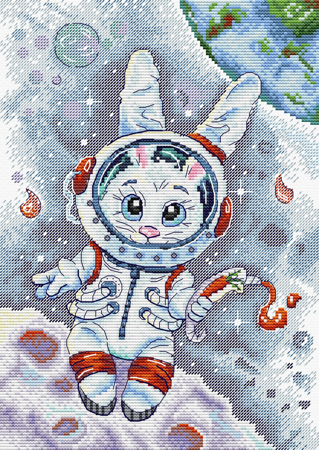 Embark on a cosmic adventure with the "Moon Hare" cross stitch kit SM-772 from MP Studia. This charming design features an astronaut rabbit floating in space, with the Earth in the background, creating a scene that combines the adorable with the astronomical.