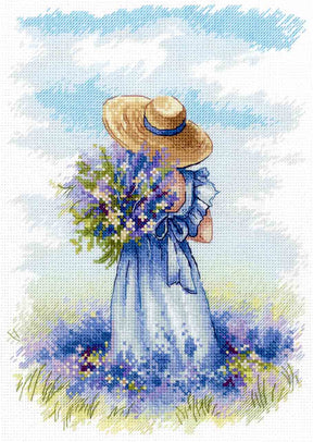 The "Lavender Walk" cross stitch kit SNV-847 by MP Studia captures the serenity of a woman in a lavender field, dressed in a beautiful blue dress and straw hat. This elegant design is perfect for those who enjoy delicate projects full of natural details. The kit includes:
