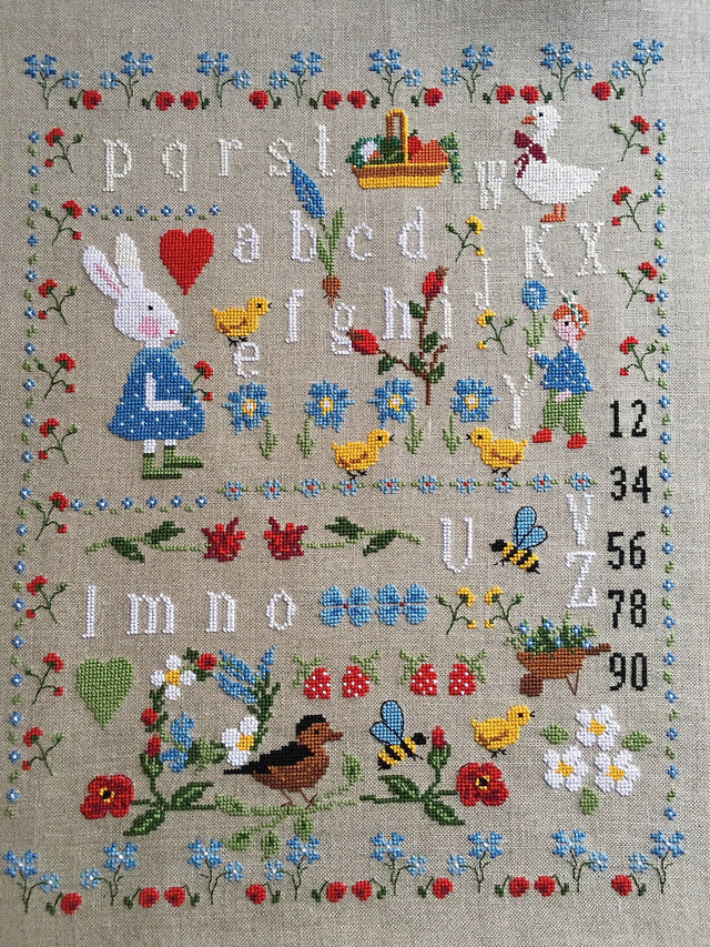 "Orchard and Garden" is a counted cross stitch scheme with a spring floral motif.
