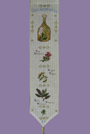 Olive oil and aromatic herbs in this cross stitch sampler from the Serenità di Campagna brand.