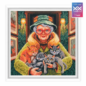 A charming design featuring an older woman surrounded by her beloved cats, perfect for animal lovers and lovers of warm, homey scenes.