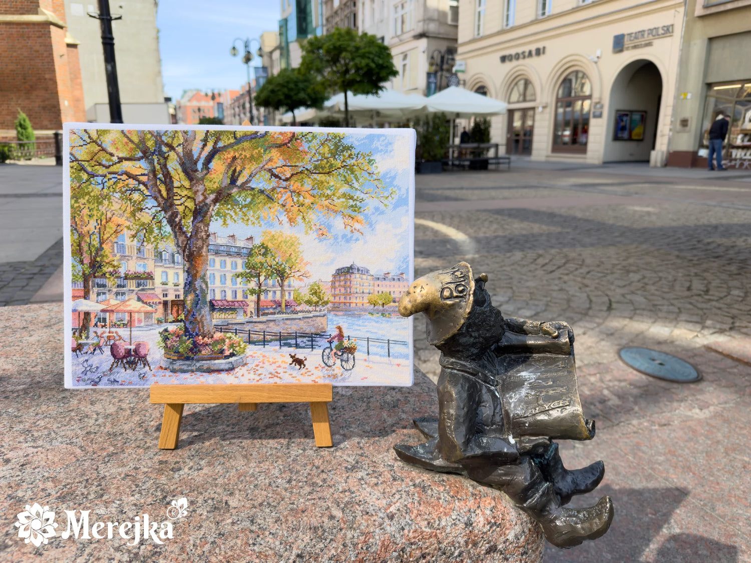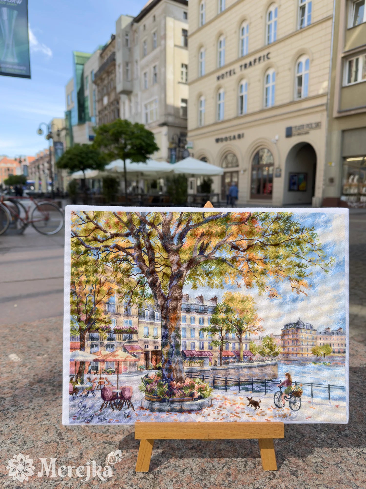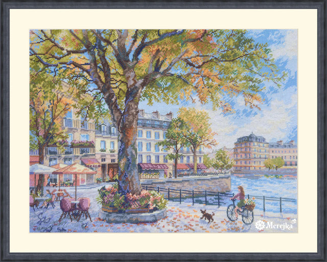 El kit de punto de cruz Merejka "Chasing Morning Light" K-269 captura la magia de una tranquila mañana junto al río, donde la suave luz del amanecer ilumina una encantadora escena urbana con terrazas, árboles otoñales y una ciclista paseando por el paseo marítimo. Un diseño lleno de vida y armonía que transmite serenidad, romanticismo y el encanto de las ciudades europeas.