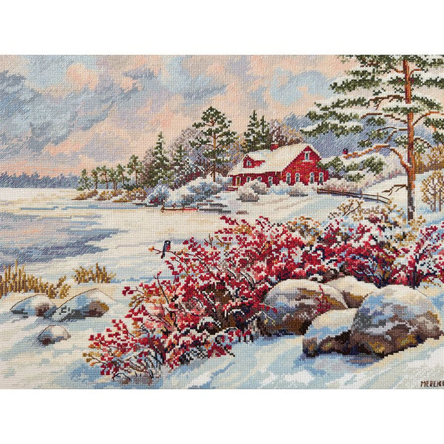 El kit de punto de cruz Merejka "The Lake House" K-261 recrea un idílico paisaje invernal con una acogedora casa junto al lago, rodeada de nieve, árboles y arbustos cubiertos de escarcha. Una escena serena y detallada que transmite calma, naturaleza y la belleza del invierno en su máxima expresión.