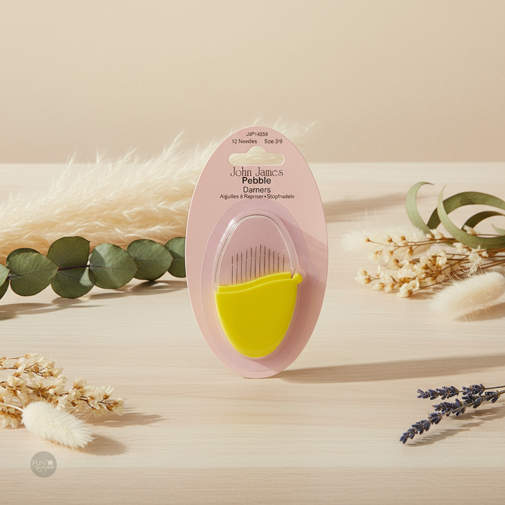 El set incluye 12 agujas en una variedad de tamaños, desde el número 3 hasta el número 9. Estas agujas de zurcir de John James están cuidadosamente diseñadas y son de excelente calidad. El estuche Pebble garantiza que las agujas estén protegidas y sean fáciles de encontrar y acceder en todo momento.