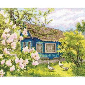 El kit de punto de cruz ANDRIANA SANS-77 – Lilacs near the House captura la esencia de la primavera rural. Un encantador paisaje con una casa azul rodeada de lilas en flor y gansos paseando en el jardín. Los colores frescos y alegres transmiten una sensación de paz, nostalgia y naturaleza viva.