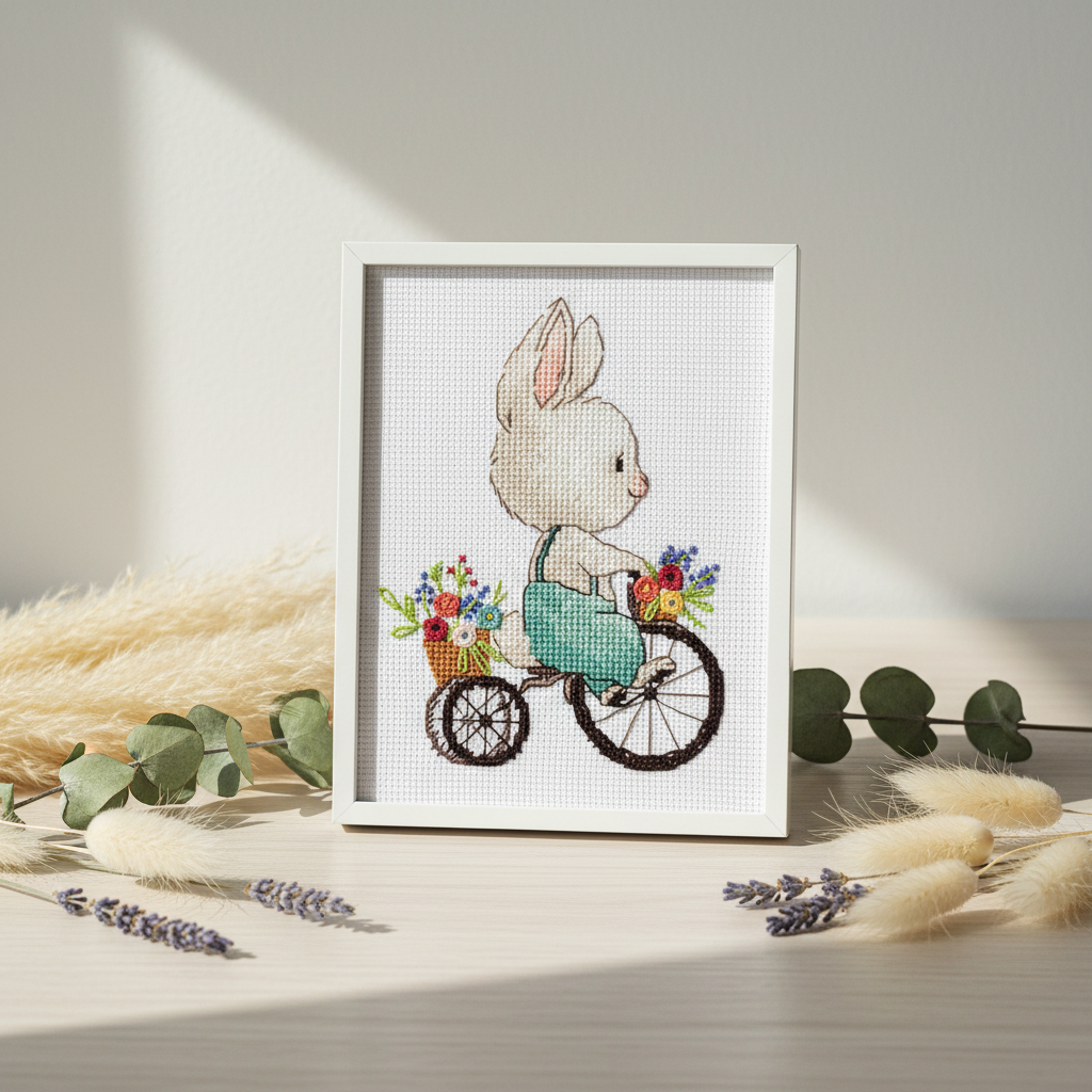 El kit de punto de cruz KLART “Conejito en bicicleta” KL8-521 es una propuesta dulce, delicada y muy encantadora para quienes disfrutan de los diseños tiernos y de pequeño formato. Este precioso modelo muestra un conejito montado en bicicleta con flores, creando una escena alegre, suave y muy decorativa, perfecta para amantes de los animales, los bordados infantiles y las composiciones llenas de ternura.