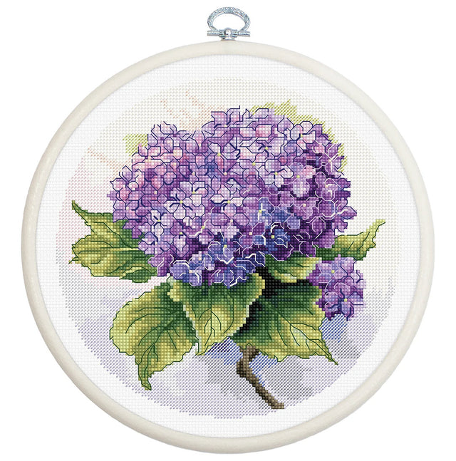 Experimenta la belleza de la hortensia en todo su esplendor con este kit de punto de cruz de Luca-S. Un ramo de flores de hortensia en tonos púrpura y azul se presenta magníficamente, prometiendo ser un encantador proyecto de bordado y una adición deslumbrante a cualquier espacio.