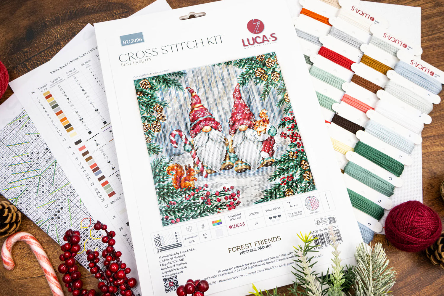 El kit de punto de cruz Luca-S “Forest Friends” (BU5096) representa a dos simpáticos gnomos navideños rodeados de un bosque nevado, piñas, bayas rojas y pequeños animales invernales. Un diseño lleno de encanto y calidez, ideal para las fiestas y perfecto para regalar o decorar tu hogar en Navidad.