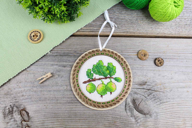 El kit de bordado MP Studia SO-130 – Miniatura “Bayas del campo: Grosellas” es un delicado diseño que representa una rama de grosellas verdes enmarcada en una base de madera decorativa. Su estilo natural y fresco evoca los colores del verano y el encanto de la vida campestre. Perfecto como adorno, regalo o pieza de colección.