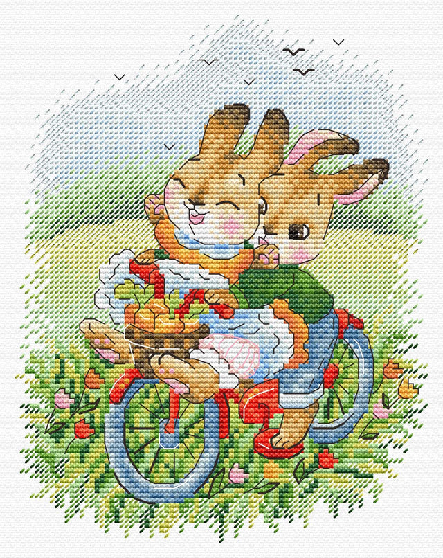 El kit de punto de cruz "With the Wind" de MP Studia presenta una encantadora escena de dos conejitos disfrutando de un paseo en bicicleta. Con colores vibrantes y un diseño alegre, esta obra captura la esencia de un día despreocupado en el campo.