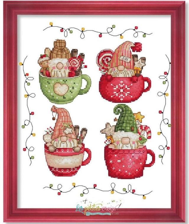 Bebidas navideñas y enanitos en este esquema de punto de cruz contado de Les Petites Croix de Lucie.