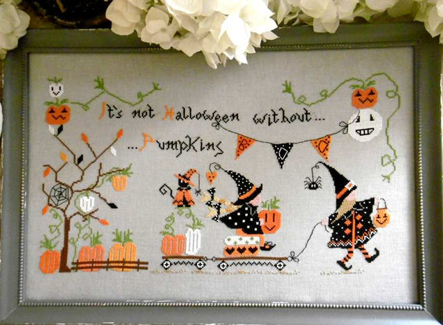 Una escena de Otoño en este sampler de punto de cruz, "Non è Halloween senza Zucche"