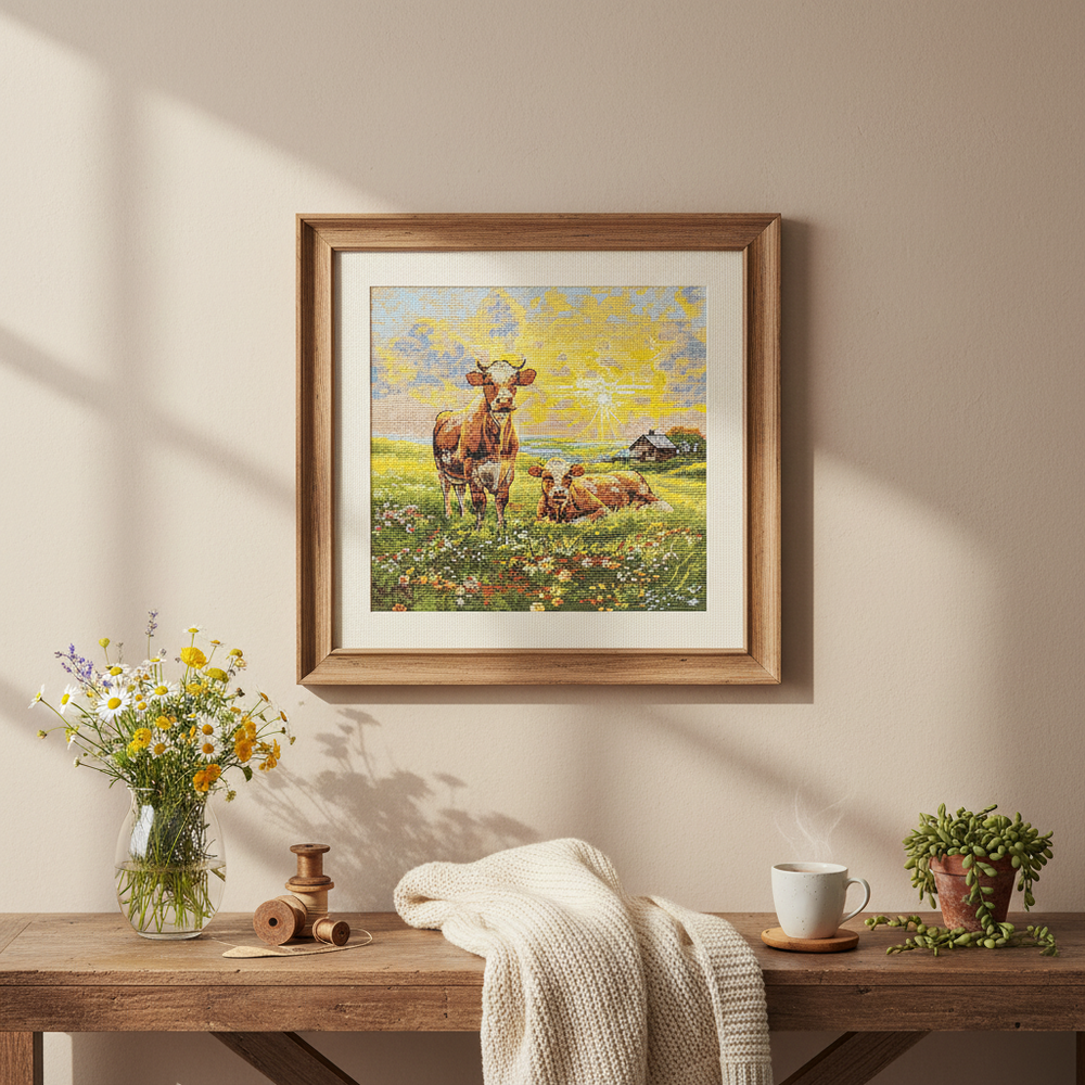 El kit de punto de cruz “En el prado” de Andriana (SANN-39) representa una escena rural tranquila y luminosa: vacas descansando y pastando en un prado florido al amanecer, con una casa de campo al fondo y un cielo bañado por los primeros rayos del sol. Un diseño armonioso que transmite calma, naturaleza y vida en el campo, ideal para amantes del bordado de paisajes rurales.