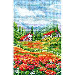 Ce kit de point de croix coloré présente un magnifique paysage avec des champs de coquelicots, des maisons rustiques et des montagnes à l'horizon, idéal pour les amateurs de nature et d'art.