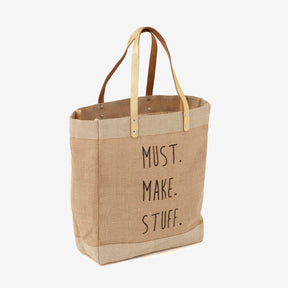 Il est fabriqué en jute, un matériau très résistant qui protégera vos objets en toute sécurité et ne subira pas de dommages dans le temps. Son extérieur est doublé de jute de différentes nuances, donnant au sac un aspect très rustique. Il porte les mots anglais MUST, MAKE et STUFF gravés dessus. Ses poignées sont dorées, ce qui apporte une touche très moderne.