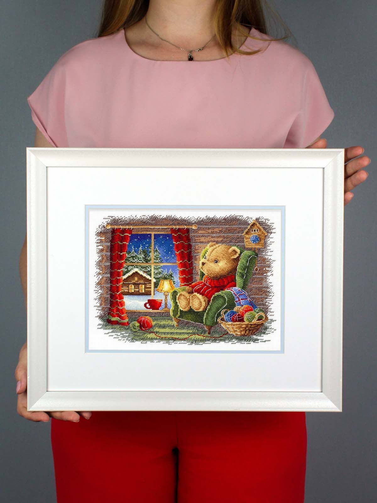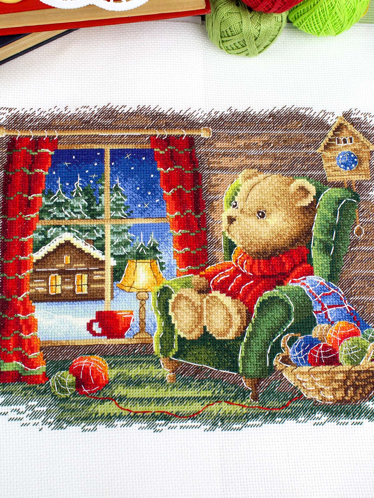 Le kit de point de croix MP Studia SNV-925 – Soirée paisible représente une scène chaleureuse et réconfortante : un ours en peluche assis près de la fenêtre, profitant d’une douce soirée d’hiver, entouré de pelotes de laine et baigné d’une lumière tamisée. Idéal pour les amoureux des motifs qui évoquent le calme, le confort et l’esprit du foyer.