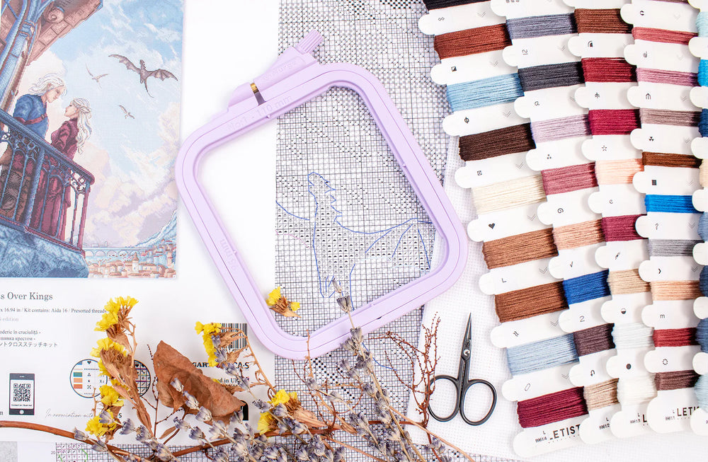 Le kit de point de croix Hearts Over Kings de Letistitch (L9961) présente une scène épique et romantique : deux personnages sur un balcon, accompagnés de dragons fendant le ciel. Un motif riche en détails et en intensité dramatique, idéal pour les amateurs de fantasy et les passionnés de projets stimulants.