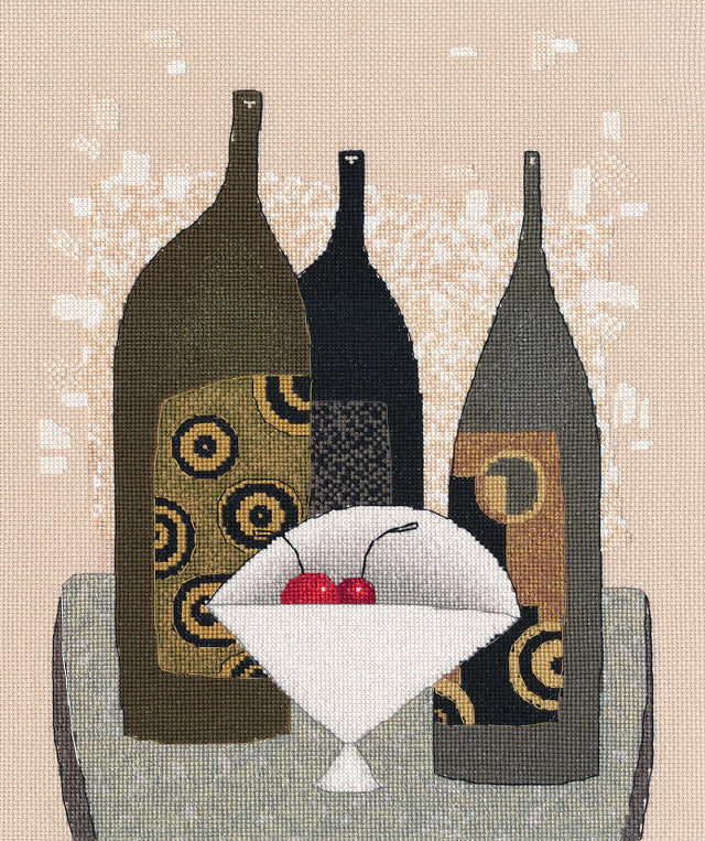 Déjate envolver por el encanto artístico del kit de punto de cruz OVEN 1678 – Siesta. Este elegante diseño combina tonos cálidos y motivos geométricos en una composición moderna con botellas y una copa con cerezas, evocando calma, sofisticación y estilo contemporáneo.