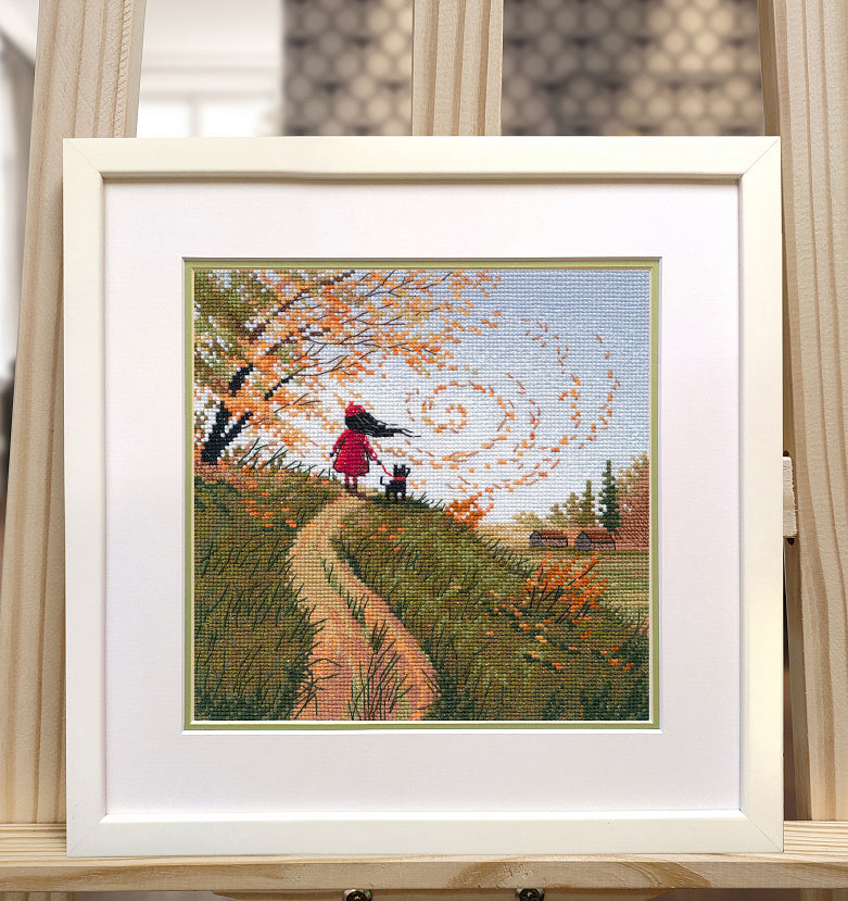 Appréciez la mélancolie et la beauté de l'automne avec ce charmant kit de point de croix : Brise d'automne . La scène représente une fille et son chat regardant les feuilles danser au vent, capturant toute la poésie de cette saison dorée.
