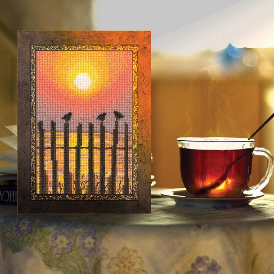 Le kit de point de croix compté « Silhouettes au crépuscule » capture la beauté d'une scène sereine et minimaliste, où des silhouettes d'oiseaux se reposent sur une clôture, alors que le soleil se couche à l'horizon. Idéal pour ceux qui cherchent à broder une œuvre simple mais pleine de sens.