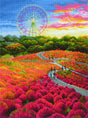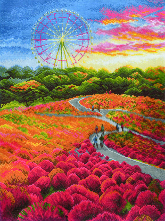 Célébrez l'explosion chromatique de la nature : avec le kit Riolis 2130 « Hitachi Park by the Sea », apportez chez vous l'atmosphère vibrante de l'un des paysages floraux les plus éblouissants du Japon, en recréant sa grande roue emblématique sous un ciel coucher de soleil.