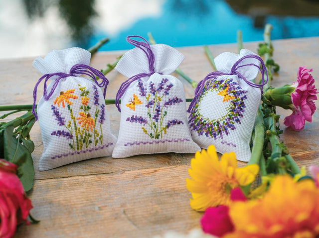 Le kit de point de croix Vervaco - Lavande x3 est parfait pour créer trois sacs aromatiques aux motifs lavande élégants.