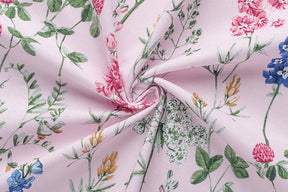 Le tissu de cette image a un fond rose pastel doux qui sert de base à un imprimé floral délicat et détaillé. Les fleurs et les feuilles se déclinent dans des tons doux de rose, bleu, vert et jaune. La palette de couleurs et le design donnent une touche féminine et romantique au tissu.