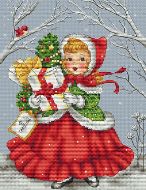 Petite fille avec ses cadeaux dans ce schéma au point de croix compté des Petites Croix de Lucie.