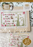 Perce-neige et texte de Noël dans ce motif de point de croix de Cottage Garden Samplings. Le motif a été brodé sur du lin 32 fils, mais vous pouvez utiliser n’importe quel tissu de votre choix !