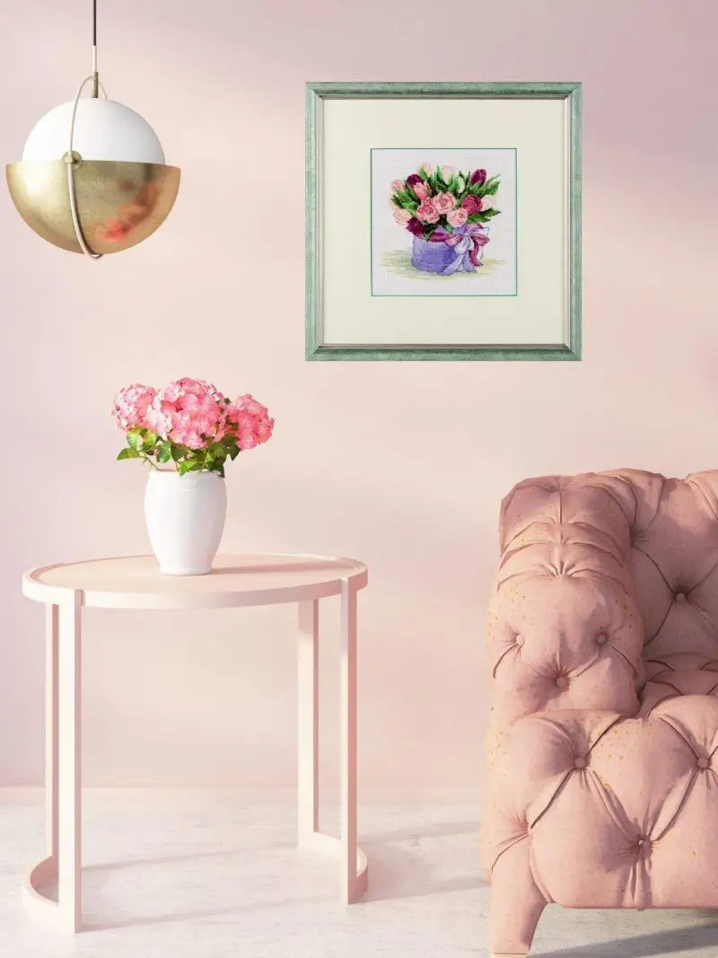 Borda un delicado arreglo floral con el Kit de Punto de Cruz Riolis 2003 – Tulips Hat Box. Este elegante diseño presenta un ramo de tulipanes en una sombrerera, perfecto para aportar un toque romántico y primaveral a tu hogar o como regalo artesanal hecho a mano.