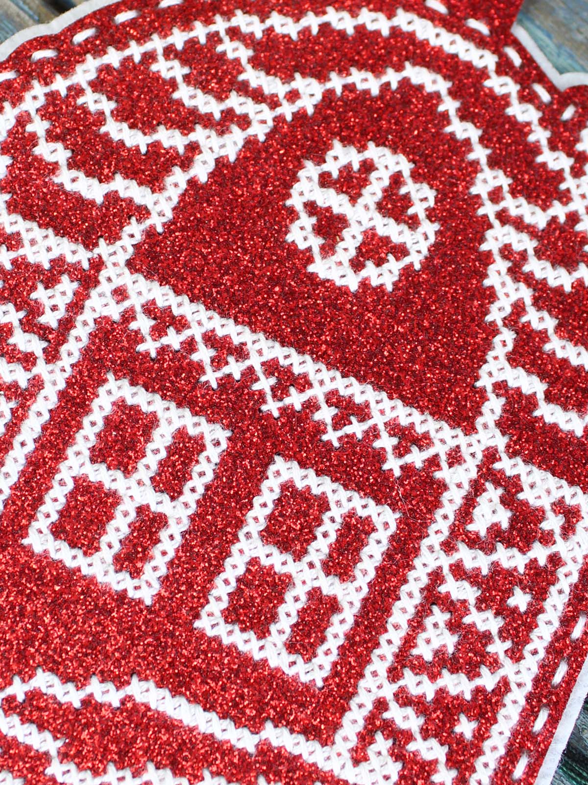 Matière : base perforée en feutrine rouge vif + feutrine blanche pour le dos