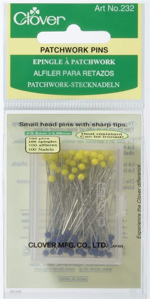 Ces épingles patchwork CLOVER 232 sont idéales pour les projets de couture et de quilting. Conçus avec une petite tête et des pointes extrêmement pointues, ils permettent une pose facile et précise sur les tissus sans les abîmer. Les têtes sont en verre résistant au fer, ce qui les rend sûres pour une utilisation pendant le repassage.