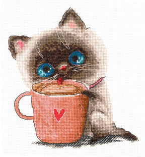 Un joli kit de point de croix intitulé « Coffee Lovers. Cat » SANK-64. Ce kit est conçu pour que vous puissiez commencer immédiatement votre projet de broderie, créant une image d'un chat aux grands yeux bleus prenant une gorgée d'une tasse de café, ce qui en fait un projet parfait pour les amoureux des chats et des animaux.