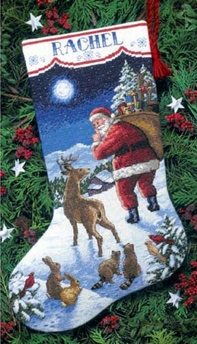 Chut ! Dites le Père Noël à ses amis les animaux dans notre bas d'arrivée du Père Noël au point de croix compté. Cette délicieuse chaussette sera un héritage familial pour les années à venir. Le kit de point de croix compté contient du fil de coton présélectionné, du fil de laine, du coton Aida blanc 14 points, du feutre de polyester, une aiguille et des instructions simples comprenant un alphabet. Taille finie : 16" de long (41 cm). Conçu par Hal Frenck. © 2002 Hal Frenck. Représenté exclusivement par Applejack Licensing Intl. of Vermont.